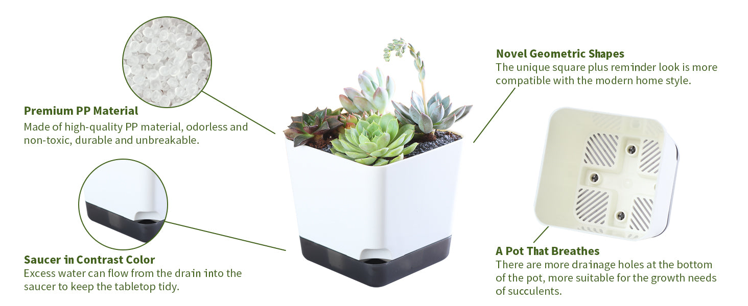 • Product Size: This succulent pot has an artistic trapezoidal design – wide at the top and narrow at the bottom. At the top is a square with a side length of 3.1 inch, and at the bottom is a water storage tray with a side length of 2.6 inch. The height is 3.1 inch.