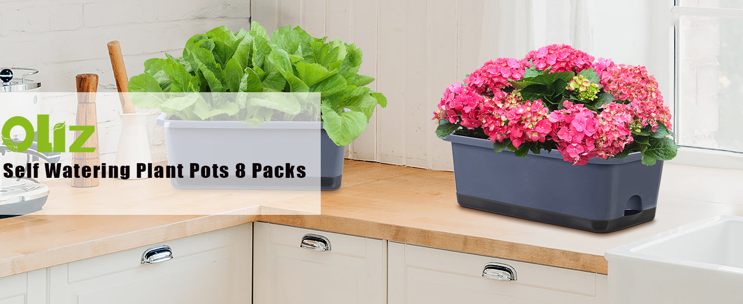 • 【Self Watering Plant Pots】Our Plant Pots are set of 8 pieces, and the size of the pot is about L17 x W7 x H6 inches, it is large enough to support any projects and ideas. Please note that plants in the images are not included! Perfect for growing all kinds of plants, like herbs, flowers, foliage, grass, cactus, succulents, ferns, arborvitae and more.